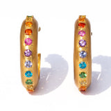 Hand-crafted 22 karat hoops are elegantly embellished with a rainbow arrangement stones.