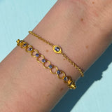 This Evil Eye Charm bracelet is delicately handcrafted with gold chain links and adorned with a pretty tanzanite.