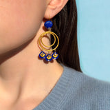 The Calypso hoops are masterfully crafted with hand carved lapis lazuli shells, delicate little tanzanites, and braided gold.